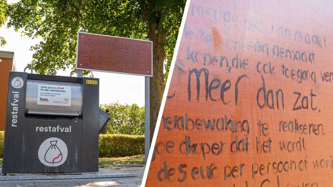 De bewoner heeft tussen twee ondergrondse containers een bord geplaatst. Daarop doet hij een oproep aan zijn buurtgenoten om zijn initiatief voor een camera te steunen. Daarnaast richt hij zich tot de daders van dumping: "U spreek ik aan, diegene die hier een vieze, smerige plek van maakt."