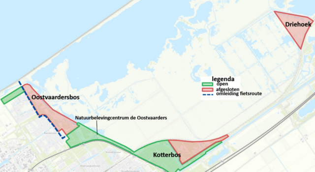 Het doorgaande fietspad door het Oostvaardersbos dat de Oostvaardersdijk met het Natuurbelevingscentrum verbindt, is tussen fietsknooppunten 67 en 97 is tijdelijk verlegd. Vanaf knooppunt 67 gaat de route naar knooppunt 97 via de Jac. P. Thijsseweg, de E.Heimansweg en de Hugo de Vriesweg. De route door het Oostvaardersbos langs het water van de Oostvaardersplassen is afgesloten tot medio mei. De omleiding wordt met borden aangegeven.