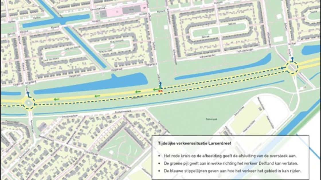 De doorgang door de middenberm van de Larserdreef bij Delfland wordt vanaf 3 februari voor twee maanden afgesloten. Daardoor kan verkeer dat vanaf Delfland de Larserdreef op wil rijden, alleen rechtsaf slaan. Het gaat om een proef. De gemeente wil onderzoeken wat dit doet met de doorstroming van verkeer en met de veiligheid. “Objectief en subjectief,” zegt wethouder Piet van Dijk.